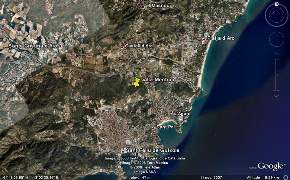 Villa Montroc (see yellow pin point on map) is located between Castell d'Aro, Platja d'Aro, S'Agaro and Sant Feliu de Guixols